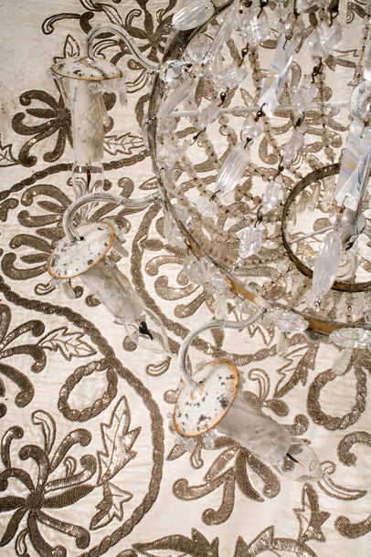 A Napoleon III tapestry, with its serpentine arabesques, covers the bottom portion. A Swedish chandelier from the end of the 18th Century, its crystal braiding rising above the table with a gold leafed crown. One has the impression that it is floating towards the bottom and yet, mysteriously being pulled upwards at the same time. The arabesques intermingle ‘ton sur ton’ within the tapestry under our feet. The result is like fine champagne, an image of luxury and opulence.