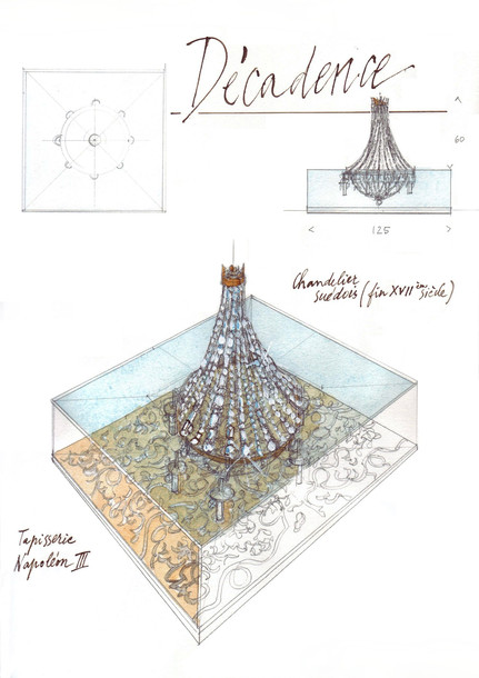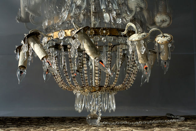 A Napoleon IIIrd tapestry, 18th Century Swedish chandelier, plexiglas,steel.